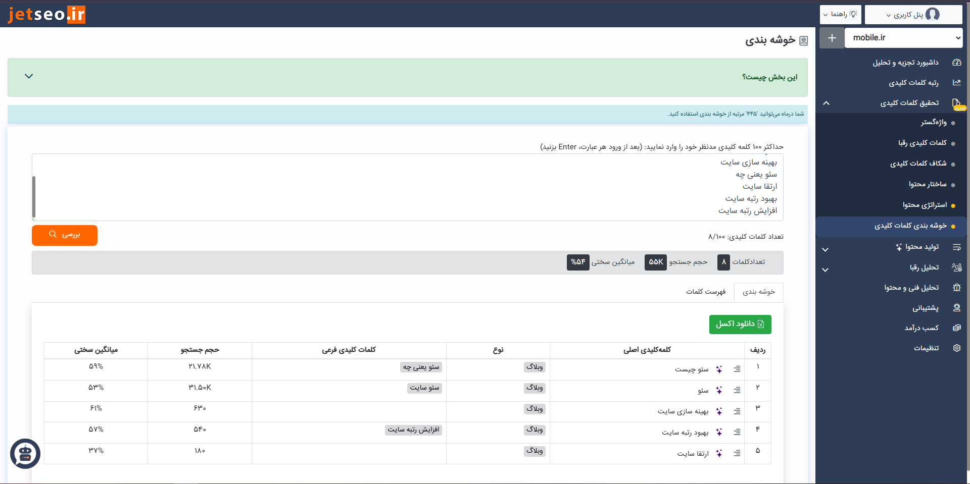 جت سئو یکی از ابزارهای قدرتمند و تخصصی در حوزه آنالیز سئو سایت است که امکانات متعددی برای خوشهبندی کلمات کلیدی در اختیار کاربران قرار میدهد. این ابزار با استفاده از الگوریتمهای پیشرفته، کلمات کلیدی مرتبط را شناسایی و آنها را در خوشههای موضوعی و هدفمند دستهبندی میکند. از دیگر امکانات ابزار جت سئو میتوان به موارد زیر اشاره کرد: