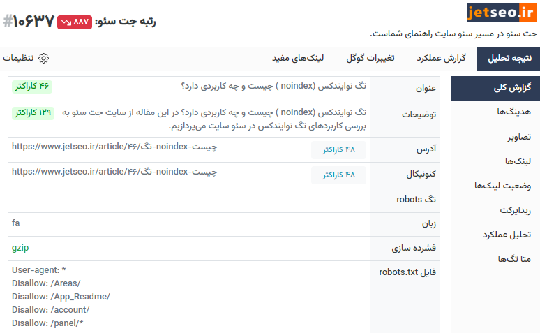 جت سئو یک ابزار آنالیز سایت آنلاین است که به کمک آن میتوانید مشکلات مختلف سایت خود را بررسی و مشخص کنید. همچنین جت سئو یک افزونه سئو کروم و سایر مرورگرها را دارد که میتواند در بررسیهای شما کمک کننده باشد. برای بررسی نوایندکس بودن یا نبودن صفحات مختلف وب پس از نصب افزونه با کلیک بر روی آیکون افزونه در مرورگر با یکی از حالتهای زیر مواجه میشوید: