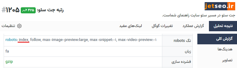 در صورتی که صفحه ایندکس باشد یکی از دو حالت زیر به وجود میآید، در حالت اول در بخش تگ robots مقداری نمایش داده نمیشود و در حالت دوم مقدار index را مشاهده خواهید کرد: